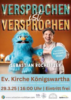 Sebastian Rochlitzer und seine blauer Freund Ulfie sind aus der christlichen Musikszene nicht mehr wegzudenken. Viele Kinder singen seines Songs und bringen nicht nur ihre Eltern, sondern auch ihre einsamen Socken mit zu seinen Konzerten. Am 29. März um 16:00 Uhr ist Sebastian Rochlitzer mit seinem neuen Programm "Versprochen ist versprochen" zu Gast in der Kirche Königswartha. Einlass ist ab 15:30 Uhr. Der Eintritt ist frei - um eine Spende zur Finanzierung des Konzertes wird gebeten. Pfr. Mahling