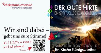 Mit der Klanginstallation "Der gute Hirte" bewerben wir uns beim Gemeindewettbewerb des christlichen Magazins "chrismon". Ab 11. März 12:00 Uhr können Sie dort für das Projekt abstimmen. Die zwölf Gemeinden mit den meisten Stimmen erhalten Publikumspreise zwischen 500,- und 2000,- EUR. Eine Jury vergibt weitere Preise. Unser erstes Ziel ist es, mit unserem Projekt bis zum 1. April zu den 12 Gemeinden mit den meisten Stimmen zu gehören und damit ins Finale einzuziehen. Darum: Stimmen Sie bitte mit! In der Qualifikationsphase ist auch eine wiederholte Stimmabgabe möglich! Der Link zur Abstimmung lautet: https://chrismongemeinde.de/projekte/67a21e0d93b32c83ef185320 oder Sie scannen mit ihrem Handy untenstehenden QR-Code. Pfr. Mahling