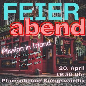 Zum FEIERabend am 20. April begrüßen wir ganz herzlich Hannah Langner unter uns. Sie hat Königswartha für ein Jahr verlassen, um in Irland Menschen zum christlichen Glauben einzuladen. Am 20. April berichtet sie in der Pfarrscheune Königswartha von ihren Erlebnissen während ihres missionarischen Jahres. Der FEIERabend beginnt um 19:30 Uhr.