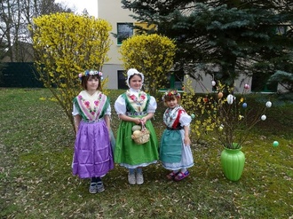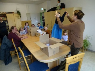 Hui, wer klopft den da an der Tür bei der Krabat-Gruppe? Und was ist in dem großen Karton? Wer an den Osterhasen gedacht hatte lag dieses Mal falsch. Kirsten Böhme vom „Verein zur Pflege der Regionalkultur Mittlere Lausitz e. V.“ besuchte unsere Kita. Sie brachte am Donnerstag, dem 30. März 2023, evangelische Trachten zu uns. Nachdem wir am 17. November 2022 bereits sorbisch-katholische Trachten erhielten wurden nun zur Komplettierung des Trachtenfundus Tanztrachten übergeben. Diese wurden gleich anprobiert und Kirsten Böhme erklärte den Erzieherinnen sowie den Kindern worauf alles zu achten sei. Die Chance wurde natürlich genutzt, um ein schönes Foto mit einem Osterkörbchen zu schießen.