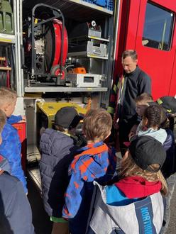Bei der Feuerwehr erfuhren wir von St. Ziesch und Max Heppner, wann und wie man die Feuerwehr „ruft“. Wir sahen uns die Ausrüstung an und durften uns mal in ein Auto setzen. Beeindruckend fanden wir die viele Technik und die Höhe der Drehleiter. Auch bei den Feuerwehrleuten möchten wir uns ganz herzlich bedanken.