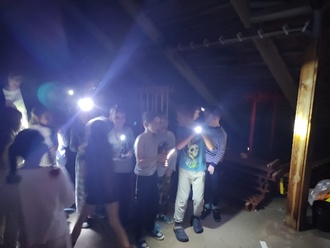 Gegen 20.30 Uhr gingen wir in unser Klassenzimmer. Wir bereiteten uns auf die Nachtruhe vor, als wir plötzlich Gespenstergeräusche auf dem Gang hörten. Die Bodentür knallte und wir erschraken. Also machten wir uns auf die Suche nach Schorschi. Wir gingen sogar mit unseren Taschenlampen auf den Boden, fanden ihn aber leider nicht.