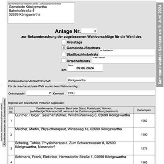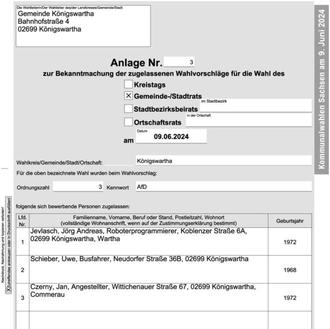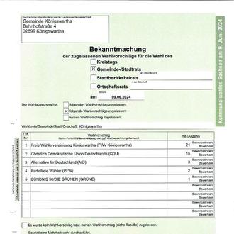 Wólbny wuběrk je zapodate wólbne namjety za přichodne komunalne wólby přepruwował a wšitke namjety, kotrež su prawniskim předpisam wotpowědowali, za komunalne wólby schwalił.