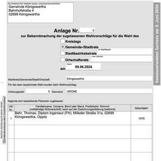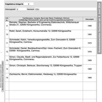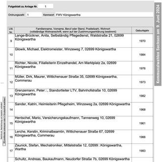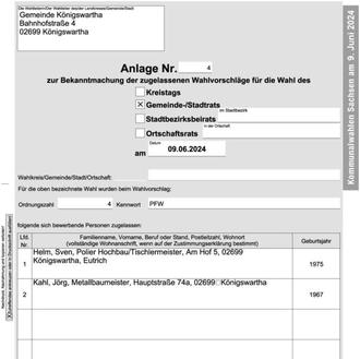 W sćěhowacym wozjewjenju su strony a wolerske zjednoćenstwa mjenowane kaž tež jich kandidatki a kandidaća, kotrež resp. kotřiž hodźa so na wólbnym dnju wolić, t. r. zo budu tute strony a wolerske zjednoćenstwa ze swojimi kandidat(k)ami na hłosowanskim lisćiku nalistowane. Tež jednotliwcy móža stać na hłosowanskim lisćiku za wólby wjesnjanosty/měšćanosty abo krajneho rady.