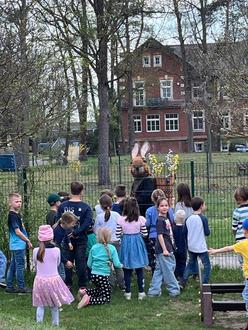 Am Nachmittag gab es dann noch eine ganz besondere Osterüberraschung für unsere Kita. Während sich die Kinder im Garten austobten, stand auf einmal der Osterhase an unserem Gartenzaun und wünschte uns eine schöne Osterzeit. Wir bedanken uns ganz herzlich bei dem lieben Osterhasen fürs Vorbeischauen. Sowohl die Kinder als auch wir Erzieher haben uns riesig über den Besuch gefreut.