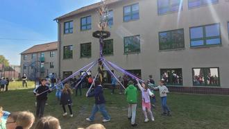 Am 14.05.25 fand das traditionelle „Maibaumwerfen“ an unserer Grundschule statt und die Drittklässler erfuhren an Stationen Wissenswertes über sorbische Bräuche und Sagen.