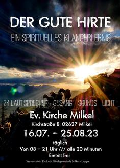Die Klanginstallation "Der gute Hirte" macht wieder Station in unserem Kirchspiel. Vom 16. Juli bis 25. August ist sie täglich von 8:00 bis 21:00 Uhr in der Kirche Milkel zu erleben. 26 Lautsprecher - verteilt im ganzen Kirchenraum schaffen ein eindrückliches Klangerlebnis. Der 23. Psalm vom guten Hirten wird so auf ganz besondere erfahrbar, es ist, als würde der ganze Kirchenraum ein einziger Klangkörper sein.