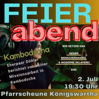 | 02.07. | 19:30 Uhr | FEIERabend mit dem Ehepaar Döhler (Droben, Kambodscha) |