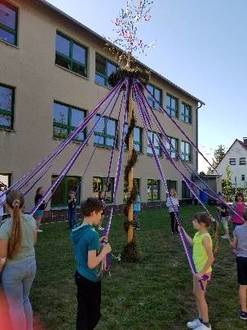 waren am 29. April tatkräftige Helfer zu Gast. Herr Melcher sorgte sich im Vorfeld um die Äste, aus denen Frau Simon, Frau Hornig, Frau Pötschke und Frau Stiebitz die Ranke und den Kranz wanden. Herr Schieback und Herr Reichel stellten den Maibaum anschließend zu Freude aller auf dem Schulgelände auf. Unser Hausmeisterteam unterstützte uns wie jedes Jahr bei der Durchführung.