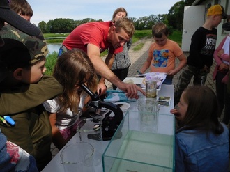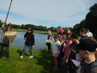 Am Ziel angekommen, begrüßte uns Dr. Lugert von der Fischereibehörde und seine Mitarbeiter Frau Herzog, Frau König und Herr Paulick. Für uns waren ein großer Behälter mit Jungfischen, verschiedene Gläser mit frisch geschlüpften Welsen und Wasserflöhen sowie ein Mikroskop vorbereitet. Neugierig schauten wir uns um, untersuchten und notierten unsere Beobachtungen. Der Fischwirtchef erzählte uns viel über Fische und die Aufgaben an den Teichen. Zum Beispiel auch, dass die Ausbildung zum Fischwirt 3 Jahre dauert. Geduldig beantworteten alle unsere Fragen zu Nahrung, Nutzen und Pflege. Nach einem Rundgang durch die Versuchsteiche wanderten wir zurück zur Grundschule.