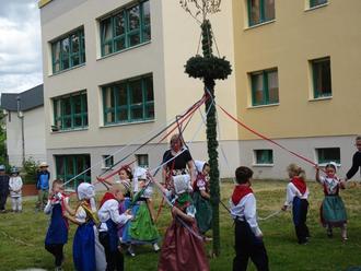 Traditionspflege ist fester Bestandteil der Arbeit in unserer Kita. Dazu zählt jedes Jahr im Mai das Maibaumwerfen. Die Jungen der Vorschulgruppen waren auch diesmal voller Eifer dabei. Schnellster war Erwin Kühn. Er wählte Yuna Drost zu seiner Maikönigin.