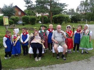 Auch schon traditionell führen die Mädchen und Jungen der Krabat-Gruppe ihr Programm im DRK-Pflegeheim auf und auch hier wird der Schnellste an der Krone des gefallenen Maibaums ermittelt. In diesem Jahr durfte sich Finn Kieschnick seine Maikönigin Grace Heiduschka wählen.