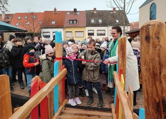 Auf dem Außengelände der Naumannschule ist Mitte Dezember ein neues Spielgerät eingeweiht und damit ein seit längerem bestehendes Problem gelöst worden. Denn das Außengelände enthält einen nicht unwesentlichen Höhenversatz, der bereits 2011 im Rahmen der Neugestaltung der Außenanlage als Rasenböschung umgestaltet worden war. Allerdings hielt dies der intensiven Nutzung des Geländes nicht stand und auch der Versuch, nachzurüsten, brachte nicht den gewünschten Erfolg. Schließlich wurde das Landschaftsplanungsbüro Merz aus Dessau mit der Überplanung dieses Teilbereichs der Schulaußenanlage beauftragt. Ziel war eine möglichst verkehrssichere, bespielbare und langlebige Lösung. Gemeinsam mit Planungsbüro und der Schule fiel die Entscheidung schließlich auf einen begehbaren Steg mit spielerischen Auf- und Abgängen. Dieser soll als Übergang vom befestigten oberen Schulhof zum unten liegenden Spiel- und Sportbereich eine Laufstrecke mit wechselnden Quer- und Längsgefällen bilden. Ein Kletternetz und eine Wackelbrücke erhöhen den spielerischen Anreiz.