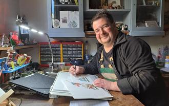 Große Knollnase, markante Augen und ein verschmitztes Lächeln: In und um Köthen (Anhalt) sind die charakteristischen Comic-Zeichnungen von Steffen Fischer fast jedem ein Begriff. Schon in Kindertagen griff der gebürtige Magdeburger – inspiriert von Bugs Bunny, Daffy Duck und Loriot – zum Zeichenstift und ließ seiner Fantasie freien Lauf. Später im Studium waren dann sogar die Rollläden der Mensa regelmäßig Leinwand für seine Figuren. Vom Hobby ins Berufliche wechselte das Zeichnen für den gelernten Diplom-Elektrotechniker mit seiner bekanntesten Schöpfung – dem Köthener Stadtmaskottchen „Halli“. Angelehnt an den historischen Turm in der Innenstadt der Bachstadt, floss ihm die niedliche Illustration 2014 aus dem Stift. „Als dann 2015 der Sachsen-Anhalt-Tag in Köthen stattfand, gab es einen Wettbewerb für das Veranstaltungsposter“, erinnert sich Fischer. „Da habe ich mich mit dem Halli beworben und die Idee kam sofort an.“ Seitdem gibt es das Maskottchen als Plüschtier, auf Schokolade oder als Trinkflasche. Seit 2020 steht sogar eine Bronze-Statue der Comicfigur vor dem großen Halleschen Turm. Vom 1. Dezember 2023 bis zum 21. Januar 2024 werden nun verschiedene Werke von Steffen Fischer im Köthener Dürerbundhaus gezeigt.