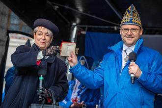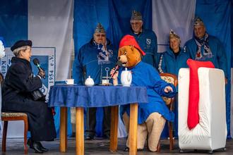 Auch wenn das Wetter nicht ganz mitspielte: am Ende zog es trotzdem viele Schaulustige am 11.11.2023 auf den Köthener Holzmarkt, um zu erleben, was sich die KUKAKÖthener Närrinnen und Narren haben einfallen lassen, um Bürgermeisterin Christina Buchheim den Schlüssel zum Rathaus abzuluchsen. Und da war auch diesmal Kreativität gefragt. In diesem Jahr nämlich, stand eine Teestunde von Bürgermeisterin Christina Buchheim und Paddington Bär – einer in Großbritannien sehr bekannte Kinderbuchfigur – auf dem Programm. Das Ganze geschah in Anlehnung an ein humorgeladenes Zusammentreffen, das es einst tatsächlich mit der inzwischen verstorbenen britischen Königin Queen Elisabeth II. und Paddingten Bär gegeben hat. Letzterer zeichnet sich nicht nur durch seine Tollpatschigkeit aus, sondern auch durch seine Vorliebe für Marmeladensandwiches, die er vorsichtshalber immer dabei hat. Natürlich spielte ein solches beim Erobern des Schlüssels dann auch eine tragende Rolle. Denn nachdem Bürgermeisterin Christina Buchheim den Schlüssel verloren glaubte, tauchte er beim Teekränzchen in einem von ihr für Notfälle vorgehaltenenen Marmeladenbrot auf – und konnte so doch noch an die Karnevalisten übergeben werden. Und zu diesem insgesamt sehr britischen Teekränzchen passte dann ja auch irgendwie das Wetter. Also Ende gut, alles gut.