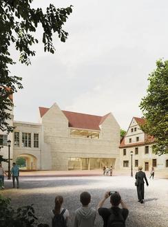 Für das neue Besucherzentrum schlagen die Planer einen ruhigen, in seinen Proportionen ausgewogenen Baukörper vor, der die städtebauliche Lücke zwischen Torhaus und Steinernem Haus schließt, ohne die prägende Giebelansicht des Steinernen Hauses zu beeinträchtigen. Der skulpturale Neubau ist subtil gegliedert und interpretiert die historischen Bauformen des Schlosses zeitgemäß.