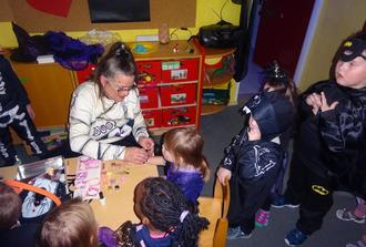 Nach dem Frühstück startete das große Halloween-Programm in unserem schaurig-schönen Bewegungsraum: Bei unserer „Grusel-Disco“ konnten sich die Kinder richtig schön austoben und bei toller Musik Spaß haben. Auch „kleine Nachtschwärmer aus Papier“ wurden gemeinsam mit den Kindern an diesem besonderen Tag gebastelt. Natürlich durften auch Geschicklichkeitsspiele wie „Monsterweitwurf“ nicht fehlen. Bei den Glitzertattoos funkelten die kleinen Hände und Gesichter. Ob Sterne, Kürbisse oder Skelette – jedes Tattoo wurde mit viel Liebe und buntem Glitzer gestaltet. Die Kinder waren sich am Ende des Tages einig: „Halloween im Kindergarten ist einfach spitze!“
