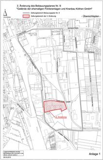 Die 3. Änderung des Bebauungsplanes Nr. 9 „Gelände der ehemaligen Förderanlagen- und Kranbau GmbH“, bestehend aus der Planzeichnung (Teil A) und den Textlichen Festsetzungen (Teil B) sowie die Begründung können bei der Stadtverwaltung Köthen (Anhalt), Abt. Stadtentwicklung, Wallstraße 1 bis 5, in 06366 Köthen (Anhalt), während der üblichen Dienststunden von jedermann eingesehen werden. Die Unterlagen können im Internetauftritt der Stadt Köthen (Anhalt) unter folgendem Link angesehen werden: https://www.koethen-anhalt.de/de/bebauungsplaene.html