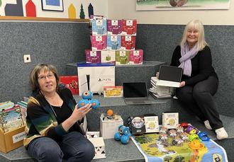 Heike Brandt und Kerstin Köhler (v.l.) freuen sich über reichlich Neuanschaffungen für den Bibliotheksbestand.
