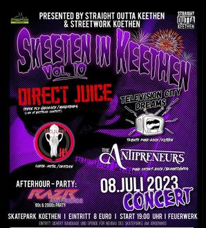 Ab 19 Uhr werden dann die besten Manöver auf vier Rollen gekürt. Beim „Best Trick“ können die Teilnehmer*innen der Jury und dem Publikum die eindrucksvollsten und schwierigsten Tricks aus ihrem Repertoire präsentieren. Den passenden Soundtrack hierzu liefert „Direct Juice“ aus Magdeburg. Weitere Bands, die im Laufe des Abends die Bühne rocken werden, sind „Helium⁵“ aus Dresden, „The Antipreneurs“ aus Braunschweig und „Television City Dreams“, die in Köthen (Anhalt) ein Heimspiel haben. Zwischen den Auftritten ist ein Höhenfeuerwerk geplant.