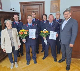 Marcus Müller und Nico Klausing haben 2028 fest im Blick. Dann wird die Ortsfeuerwehr Wülknitz 100 Jahre alt und die beiden Wehrmänner möchten ihre Kameradinnen und Kameraden als neues/altes Führungsduo in die Jubiläumsfeierlichkeiten führen. Der Rückhalt in der Truppe ist definitiv da: Müller wurde Ende Februar einstimmig als Ortswehrleiter wiedergewählt. Genauso fiel auch das Votum für Klausing aus, der erstmals für den Posten des stellvertretenden Ortswehrleiters kandidiert hatte. Beide wurde nun offiziell von Oberbürgermeisterin Christina Buchheim als Ehrenbeamte berufen.