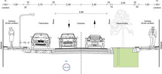 So soll die Aribertstraße nach dem Ausbau aussehen. Parkmöglichkeiten sind beidseitig (auf einer Seite durchgängig, auf der anderen zwischen den Baumstandorten) vorgesehen.