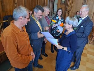 Uwe Raubaum, Uwe Schönemann, Ronald Maaß und Kerstin Beutler (v.l.) erhielten von Bürgermeisterin Christina Buchheim und dem Stadtratsvorsitzenden Georg Heeg eine Anerkennungsurkunde für jahrelanges kommunalpolitisches Engagement.