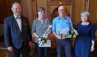 Bürgermeisterin Christina Buchheim (r.) und der Stadtratsvorsitzende Georg Heeg (l.) verabschiedeten die scheidende Ortbürgermeisterin Diana Eiternick und den scheidenden Ortsbürgermeister Adolf Tauer.