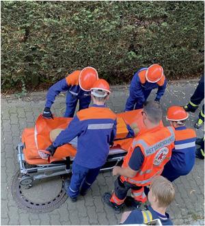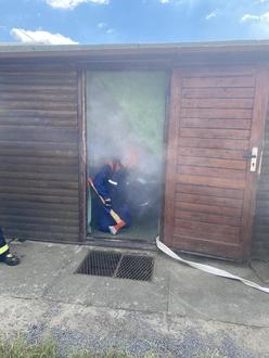 Um 17 Uhr forderte uns der „Rettungsdienst“ nach, denn im Dachgeschoss einer Wohnung galt es eine verletzte Person sorgsam mit Hilfe des Tragetuchs nach unten zu bringen. Dies gelang der Besatzung des Löschfahrzeugs. Nach einer Stärkung beim Abendessen wurden wir wieder alarmiert - ein Garagenbrand forderte unsere gesamte Einsatzstärke. Wir stellten die Wasserversorgung her, und der Angriffstrupp ging mit Pressluftatmern zur Personenrettung in die verrauchte Garage vor. Nachdem die Person gefunden und gerettet wurde, mussten noch Benzinkanister und Gasflaschen geborgen werden, bevor der Brand gelöscht werden konnte.