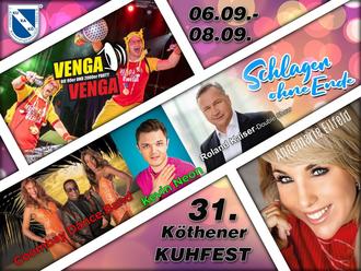 Vom 6. bis 8. September 2024 findet im Schloss Köthen das 31. Köthener Kuhfest statt. Start ist am Freitagabend mit dem KUKAKÖ-Open-Air 89.0 RTL: VENGA VENGA. Samstag und Sonntag geht es ab 11 Uhr los – mit vielen Programm-Highlights. Ob Frühschoppen, Zumba Party, „KUKAKÖ-Schlager ohne Ende“ am Samstagabend oder ein „Kessel Super-Buntes“ mit Annemarie Eilfeld am Sonntag – für beste Unterhaltung ist in jedem Fall gesorgt. Auch die Kleinen kommen auf ihre Kosten: Von Freitag bis Sonntag zwischen 10 und 23 Uhr ist Rummel auf dem Köthener Marktplatz. Außerdem sorgt am Samstag und Sonntag von 11 bis 18 Uhr ein Hüpfburgenparadies sowie Ponyreiten und eine Trampolinanlage im Schlosspark für gute Unterhaltung. Das komplette Programm mit allen Veranstaltungshöhepunkten finden Sie im Innenteil dieses Amtsblattes auf Seite XX.