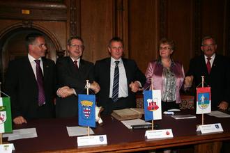 Schulterschluss der Partnerstädte: Zum Jubiläum "20 Jahre Städtepartnerschaft" trafen sich 2010 VSchulterschluss der Partnerstädte: Zum Jubiläum "20 Jahre Städtepartnerschaft" trafen sich 2010 Vertreter*innen aller vier Kommunen in Köthen (Anhalt).