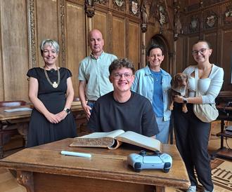 Levy Finn Rieck spielte seit 2021 zunächst für Hansa Rostock und greift seit 2023 für das Team RBLZ Gaming zum Controller, mit dem er 2024 schon den DFB ePokal gewinnen konnte. Als professioneller E-Sportler trainiert der 23-Jährige fünf bis sieben Stunden täglich und muss über Reaktionszeiten verfügen, die denen von Formel-1-Piloten nahekommen. Im August tritt Rieck dann bei der E-Sports Weltmeisterschaft in Riad an und wird auch dort seine Heimatstadt repräsentieren. Im Rahmen der Eintragung wurde heute auch im Ratssaal gegen den virtuellen Ball getreten. Levy Finn Rieck brachte Köthens Oberbürgermeisterin seinen Beruf – und den Playstation-Controller – näher.