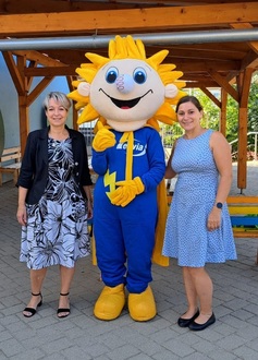Köthens Bürgermeisterin Christina Buchheim (l.) mit dem EnviaM-Maskottchen „Kilowattchen“ und der enviaM Kommunalbetreuerin Stefanie Ladenthin.