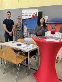 Die Stadtverwaltung Köthen war Anfang September auf der Berufsmesse in der Berufsbildenden Schule Anhalt-Bitterfeld vertreten. Die Auszubildenden des ersten Lehrjahres Tobias Krahmer und Leonie Menz stellten dort gemeinsam mit Ausbildungsleiterin Anke Kraus den Inhalt der Ausbildung zum/r Verwaltungsfachangestellten vor und warben um eine Berufsausbildung bei der Stadt Köthen (Anhalt). Aktuell können sich Interessierte wieder für eine solche mit Beginn am 1. August 2025 bewerben. Bewerbungsfrist ist der 30. November 2024. l
