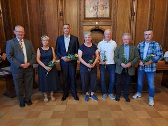 Auf der jüngsten Sitzung des Stadtrates der Stadt Köthen (Anhalt) sind die Ortsbürgermeisterinnen und Ortsbürgermeister der Köthener Ortschaften vom Vorsitzenden des Stadtrates, Georg Heeg, (Foto links) und Köthens Oberbürgermeisterin Christina Buchheim (2.v.l.) offiziell vorgestellt und im Amt begrüßt worden. Ihre Ernennungsurkunden hatten sie bereits zu einem früheren Zeitpunkt erhalten. Künftig kümmern sich Thomas Naumann für Merzien, Katrin Schild für Elsdorf, Heiko Weise für Baasdorf, Uwe Wittmann für Dohndorf, Tobias Kasperski für Arensdorf (v.l.) und Karin Krietzsch für Wülknitz (nicht auf dem Foto) um die Geschicke der jeweiligen Ortschaft. In Löbnitz an der Linde wurde noch kein/e Ortsbürgermeister/in bestimmt. Hier steht Ende des Jahres zunächst noch eine Ergänzungswahl des Ortschaftsrates an.