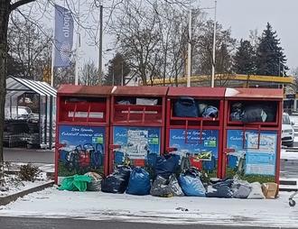 Regelmäßig und seit einiger Zeit in den letzten Monaten sehr häufig werden Säcke mit noch brauchbarer Kleidung vor den Containern abgestellt, wenn diese voll sind. Die Sammelplätze sehen dann entsprechend unordentlich, und unsauber und müllig aus (siehe Beispielbild).