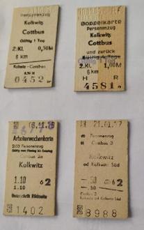 Am Fahrkartenschalter kaufte man sich vor Antritt der Fahrt eine Fahrkarte. Sie kostete von Kolkwitz nach Cottbus für die 2. Klasse vor der Wende für die 6 km 0,50 M und galt für einen Tag. Ein km kostet 8 Pfg. in der 2. Klasse und in der 1. Klasse 11,6 Pfg. Die Fahrkarte wurde auf Karton auf einer mechanischen Druckmaschine gedruckt, die die verschiedensten Zielorte enthielt. Nach allen Orten, die die Maschine im Programm hatte, konnte man Fahrkarten kaufen, die beim Betreten des Bahnsteiges oder im Zug kontrolliert wurden. Ich fragte einmal die Schaffnerin, warum sie ein Loch in die Karte macht. Sie antwortete witzig: „Ohne Loch kann man keinen fahren lassen.“