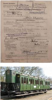 Oberes Bild: Antrag auf eine Arbeiterrückfahrkarte Unteres Bild: Personenzugwaggon um 1960