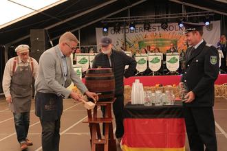 Zum Festbieranstich dabei war neben dem Bürgermeister Karsten Schreiber (l.) und dem Gemeindewehrführer Steffen Theiler (r.) der Erfinder des Festes Jürgen Türk (Mitte).