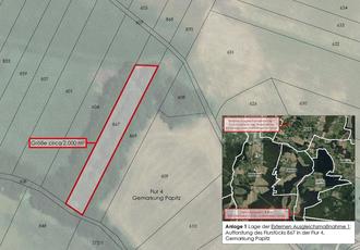 Zum Ausgleich des beanspruchten Bestandes von 119 m² Forstfläche innerhalb des B-Plan- und Baugebietes, mit der Waldfunktion WF 8101 Erholungswald, Intensitätsstufe 1 und Waldfunktion WF 3300 Lärmschutzwald wird außerhalb des Geltungsbereichs des B-Planes, auf dem Flurstück 867 in der Flur 4, Gemarkung Papitz, eine Fläche aufgeforstet. Die Lage ist dem angehängten Plan zu entnehmen.