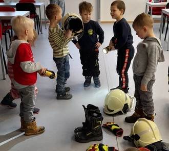 Zum Aufwärmen ging es wieder in den Aufenthaltsraum. Dort erwartete uns eine warme Tasse roter Feuerwehrtee und dann durfte die Ausrüstung der Feuerwehrmänner und -frauen bestaunt und sogar ausprobiert werden. Jedes Kind wollte gern mal den Helm aufsetzen, die Stiefel anziehen oder die Taschenlampe benutzen. Das Staunen war groß.
