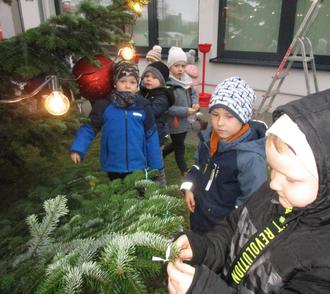 Die Wichteltruppe hing mit dem Leiterwagen die großen Kugeln dran und die Kinder verteilten mit viel Freude ihren selbst gebastelten Baumschmuck.