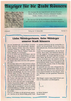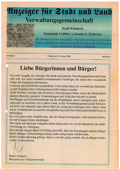 heute begehen wir das 25-jährige Jubiläum unseres Amtsblattes, besser bekannt als „Könneraner Stadtanzeiger“. Unser Amtsblatt ist in einer besonderen Art und Weise geprägt. Dies zeigt sich darin, dass es kein reines Mitteilungsblatt für öffentliche und amtliche Bekanntmachungen ist, sondern auch vor allem unsere Vereine und Institutionen hier eine Präsentationsplattform haben. Diese Form, dass die Vereine hier kostenfrei Ihre Feiern und Feste bewerben können, ist mir persönlich sehr wichtig und wird auch in Zukunft so beibehalten. So prägt dieses kleine, lokale Blatt bereits seit 1999, als es am 22. Januar das erste Mal erschienen ist, monatlich unseren Alltag in Könnern und den Ortsteilen mit. Aber auch hier ist der Wandel der Zeit zu erkennen. Wie sich das Blatt an sich in der Form und im Design verändert hat, sieht man, wenn man sich die alten Ausgaben einmal anschaut. Auch in den vergangenen Jahren gab es einige Änderung. So erscheinen seit mehr als 2 Jahren die monatlichen Ausgaben auch auf der Internetseite der Stadt Könnern als E-Paper. Ebenfalls wurde der „Anzeiger der Stadt Könnern“ zum offiziellen Amtsblatt umgewidmet und hat somit auch für amtliche Bekanntmachungen einen förmlichen Charakter. Ebenfalls möchte ich Ihnen, liebe Könneranerinnen und Könneraner, durch die neugestalteten Titelseiten das Lesen unseres Blattes noch attraktiver gestalten und Ihnen noch mehr wissenswertes und neues aus dem monatlichen Stadtgeschehen vermitteln. Denn in einer Zeit, in der wir immer mehr Fake-News und der missbräuchlichen Verwendung von Informationsverbreitung ausgesetzt sind, ist mir eine direkte und unmittelbare Kommunikation und Information unserer Bürgerinnen und Bürgern ein großes Anliegen. In den vergangen 25 Jahren hat sich allerdings auch eines gezeigt, nämlich dass das Verlagshaus Linus und Wittich für uns ein zuverlässiger Partner ist, mit dem wir einen seriösen und kompetenten Partner an unserer Seite wissen. Dafür möchte ich mich im Namen der Stadt und der Verwaltung ganz recht herzlich bedanken.