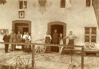 Abb.: Familie Becker mit Angestellten vor der „Beckerschen Schmiede“ in Beesenlaublingen