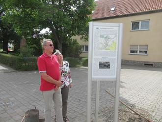Der Beton um die Pfosten der Tafel war noch nicht ausgehärtet, da kamen bereits die ersten Neugierigen, um sich über die Geschichte des Dorfes Beesenlaublingen zu erkundigen. Im Bild sind die Eheleute Pröschel vom Heimatverein des Nachbarortes Alsleben zu sehen.