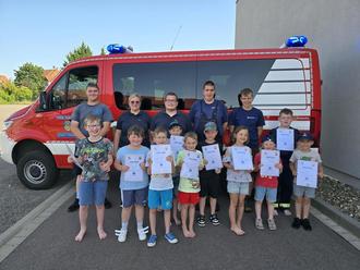 Unsere Rasselbande hat einmal einen Einblick in die Ausbildung und Arbeit einer Rettungshundestaffel erhalten. Wir waren alle sehr begeistert und freuen uns auf ein nächstes Treffen. Nachdem die Hunde alle Kinder wieder gefunden hatten, gab es für alle Eis und eine Abkühlung im Pool. Zum Abschluss konnten wir allen Kindern die Kinderflamme Stufe 1 überreichen. Gleichzeitig haben wir uns dieses Jahr von drei Kindern verabschiedet, welche nun in die Jugendfeuerwehr wechseln.