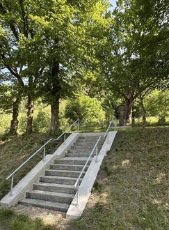Die umfangreichsten Maßnahmen wurden am Denkmal an der ehemaligen Grundschule in Zechenbach erforderlich. Die Fundamentplatte musste erneuert werden, ohne den Denkmalstein und die Säulen der Einfassung zu versetzen – eine Aufgabe, die große Sorgfalt erforderte, um die historische Optik zu bewahren. Zusätzlich wurden die Zugangstreppen sowie Geländer und Einfassung erneuert, damit der Platz um das Denkmal auch wieder sicher zugänglich und ein würdevoller Ort ist. Da die letzte ehrenamtliche Reinigung auf Initiative des Ortschaftsrates mit Unterstützung der Kameraden von der Freiwilligen Feuerwehr Oberzwota bereits 10 Jahre zurücklag, wurde der Denkmalstein noch gereinigt, neu verfugt und die Beschriftung „Ton in Ton“ aufgefrischt, um die ursprüngliche Lesbarkeit und das Erscheinungsbild zu wahren. Ein besonderer Dank geht hier an die Eigentümerin des Grundstücks, die die Arbeiten erlaubte und durch die Bereitstellung von Wasser unterstützte – eine kleine, aber wichtige Hilfe, die den reibungslosen Ablauf ermöglichte.