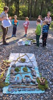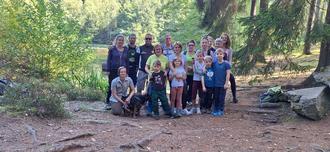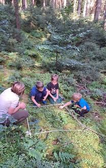 Am Samstag, den 20.09.2025 hieß es wieder für interessierte Familien unserer Kita “Die Wanderschuhe geschnürt und den Rucksack gepackt“. Diesmal unternahmen wir eine Försterwanderung ins Revier Erlbach. 8 Kinder und 11 Erwachsene trafen sich bei strahlendem Sonnenschein und angenehmen warmen Temperaturen in Eubabrunn. Dort wartete bereits die Beauftragte für Presse- und Öffentlichkeitsarbeit Luisa Lüttschwager vom Staatsbetrieb Sachsenforst Forstbezirk Adorf uns Wanderer. Die ca. 5 km lange Wanderung mit verschiedenen Wissensstationen versprach spannend und interessant zu werden. Damit uns der Weg zur ersten Station nicht langweilig wurde, hatten alle die Aufgabe, Tiere zu erraten mit dem Spiel „Wer bin ich“. So mancher Waldwichtel war hier ganz schön eifrig und hatte am Ende gleich mehrere heimische Waldtiere erraten. An unserer ersten Station sollten wir nun, aufgeteilt in Kinder- und Erwachsenengruppen, ein Haus mit Keller, Erdgeschoss, erste Etage und Dachgeschoss aus Naturmaterial bauen bzw. legen. Anhand dieses Hauses erklärte uns Försterin Luisa Lüttschwager den Aufbau des Waldes von der Wurzel- / Bodenschicht über die Moosschicht, Krautschicht, Strauchschicht bis zur Baum-/Kronenschicht. Nun galt es, die erratenen Tiere dort zuzuordnen, wo sie leben. An der nächsten Station, beim Waldmemory, war unser Gedächtnis und geschultes Auge gefragt. Als klarer Sieger ging hier die Kindergruppe hervor. Bäume an der Rinde zu erkennen, oder zu entdecken wie viele unterschiedliche Pflanzen und Moose auf einem halben Quadratmeter des Waldbodens wachsen, waren ebenso interessant, wie das Zuordnen der Tiere zum Lebensraum „Am Wasser“ oder „Im Wasser“. In Eubabrunn auf dem Spielplatz ließen wir unsere Försterwanderung ausklingen. Unsere Waldwichtel konnten auf dieser Tour ihr bereits durch unsere Waldtage erlangtes Wissen testen und viel Neues und Interessantes aus der Pflanzen- und Tierwelt unseres heimischen Waldes erfahren. Und auch die Erwachsenen frischten ihr Wissen auf und haben das eine oder andere dazugelernt.