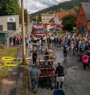 Ein erlebnisreicher Samstag voller Feuerwehr liegt hinter uns. Ein besonderer Tag, um all den Gästen dieses besondere Ehrenamt näher zu bringen. Den Tag über begleitete uns das Stadtorchester Klingenthal, die Kinder konnten ein Quiz absolvieren oder gemeinsam mit dem Kindergarten Kids+Co sich schminken lassen. Auch konnten ganz viele neugierige Fragen endlich eine Lösung erhalten, sei es über Technik oder Ausbildung. Zwei besondere Highlights darf man dabei nicht vergessen. Die Vorführung des Wettbewerbs Gruppenstaffette der Jugendfeuerwehr und der große „Gebäudebrand“. Dort erhielten wir Unterstützung aus vergangener Zeit von der Feuerwehr Grünbach und ihrer historischen Handdruckspritze, die im Erstangriff bereits erste Flammen bekämpfen konnte. Doch den Hauptauftritt hatte unsere Einsatzabteilung, die eindrucksvoll eine moderne Brandbekämpfung präsentierte und unsere Fähigkeiten unter Beweis stellte.