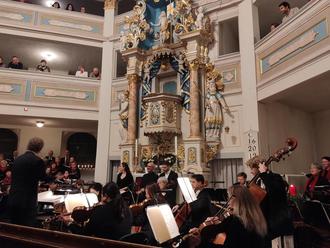 – eine grandiose Kombination, welche Kulturliebhaber am Samstag, den 20. Dezember 2025 in Klingenthal erleben durften: In der Rundkirche „Zum Friedefürsten“ führte die Vogtland Philharmonie Greiz/ Reichenbach unter der Leitung von GMD Stefan Fraas das Weihnachtsoratorium von Johann Sebastian Bach auf. Gemeinsam mit Solisten und dem Kantatenchor Greiz bereitete das Orchester seinem Publikum eine bewegende Einstimmung auf das unmittelbar bevorstehende Weihnachtsfest. Abschließend stimmten Aufführende und Zuhörer gemeinsam „Oh du fröhliche …“ an. Bereits 2024 bot Stefan Fraas die Idee zu diesem Konzert vor barocker Kulisse. Eine Aufführung 2026 ist bereits in Planung. Ein großer Dank gilt deshalb ihm in Person, allen Mitwirkenden und außerdem der Kirchgemeinde, welche das Konzert auch durch ehrenamtliches Engagement vor Ort möglich gemacht hatte. Die Große Kreisstadt Klingenthal unterstützte Vorbereitung und Durchführung organisatorisch.